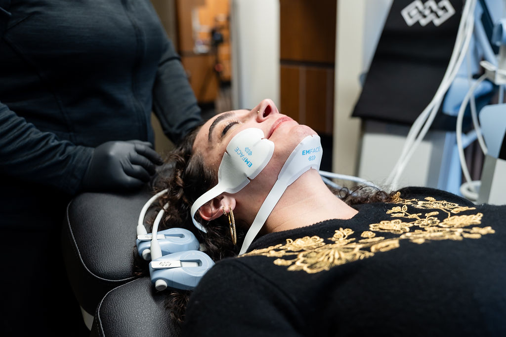 Neither treatment is painful. EMFACE feels like a warm facial massage combined with gentle muscle contractions — no needles, no downtime. EMSELLA involves sitting fully clothed in a special chair while electromagnetic energy activates your pelvic floor muscles. You'll feel strong contractions, but patients describe it as unusual rather than uncomfortable. Both treatments take 20-30 minutes with zero recovery time.